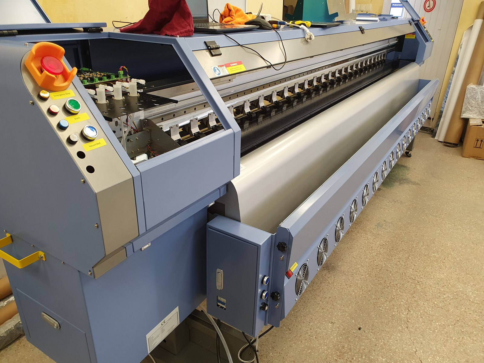 Это станок из скоростной линейки сольвентных принтеров от Challenger, он способен разгоняться до 260 кв.м/ч в максимальной комплектации.